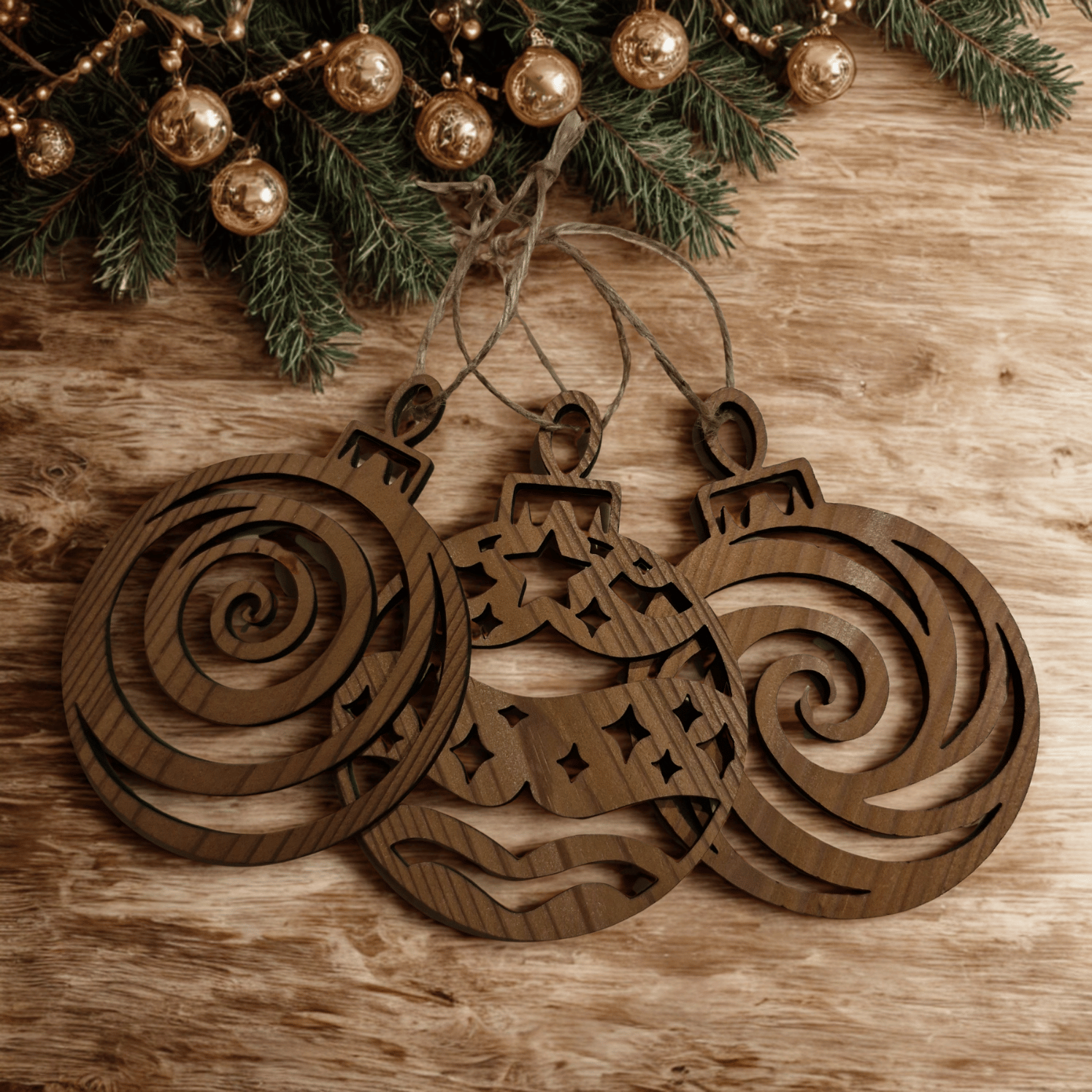 Kolmest termopuidust jõuluehest koosnev komplekt, kus kõigil on sama kuju, aga keskosas erinev muster. Ühel täheke, kahel erinevad spiraalid. Laseriga lõigatud, umbes 9 cm diameetriga ja 5 mm paksusest puidust. Sobivad eriti hästi kingipakki või rahulikuma stiiliga jõulukaunistuseks.