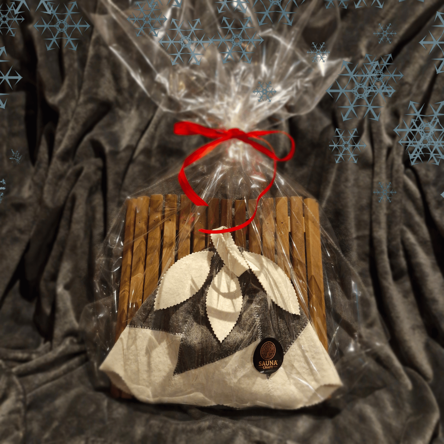 Eksklusiivne sauna kinkekomplekt tumeda termolep­p­a peatoe ja saunamütsiga. Ideaalne kingitus inimesele, kes armastab hubast saunakogemust.